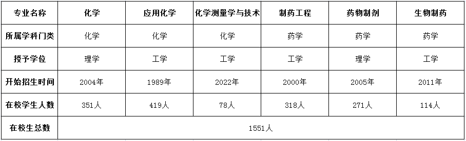 化学与制药工程学院现有应用化学、化学测量学与技术、化学、制药工程、药物制剂和生物制药六个本科专业。